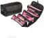 Our bag is your travel buddy for cosmetics, jewelry and toiletries! Compact, Stylish, Convenient, Practical, each features 4 spacious zippered compartments, hanging loop and the snap closure compact design. Alphabet designer look outer shell in black featuring letters of the alphabet in large and small casings with pink interior and 4 see through compartments.